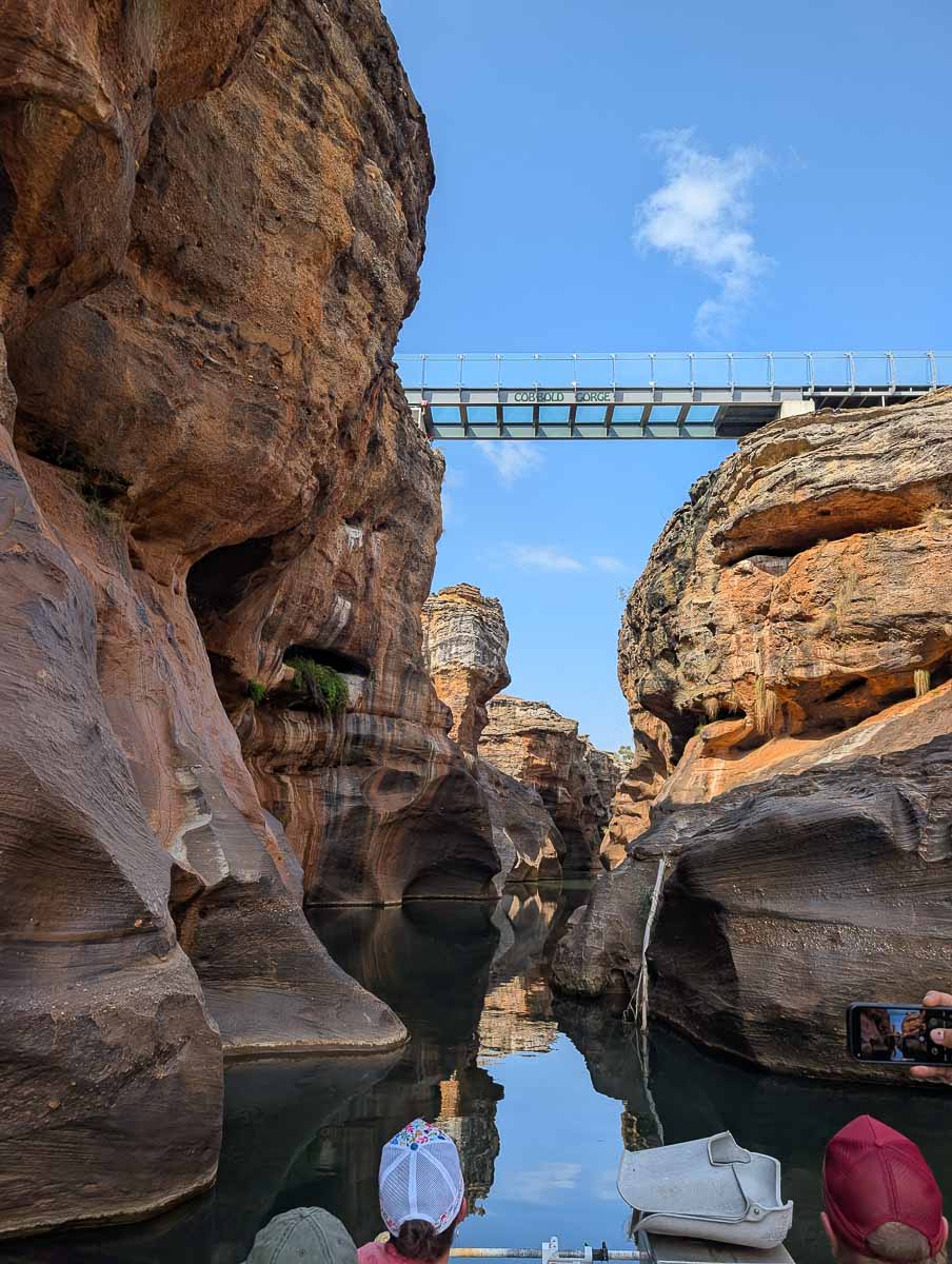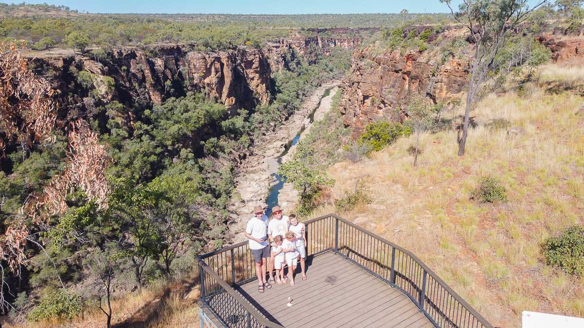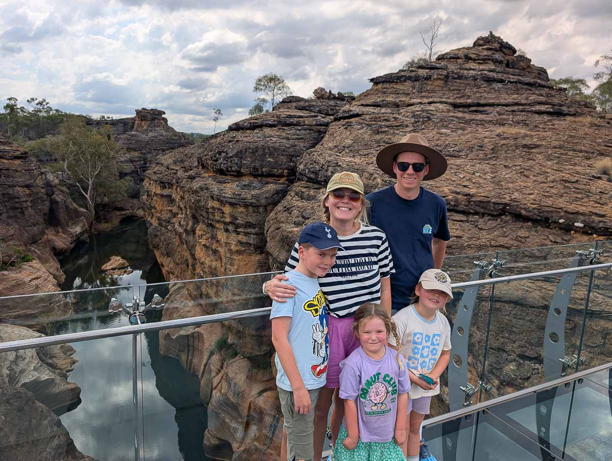 After the boat tour we went on a short walk up and around to the top of the sandstone escarpment for a walk over the glass-bottomed bridge. I had to bribe Brooklyn with a coke later on for him to return to the glass bridge after scurrying across quickly. Heights are not his thing. We got a nice family photo but he looks very tentative in it.