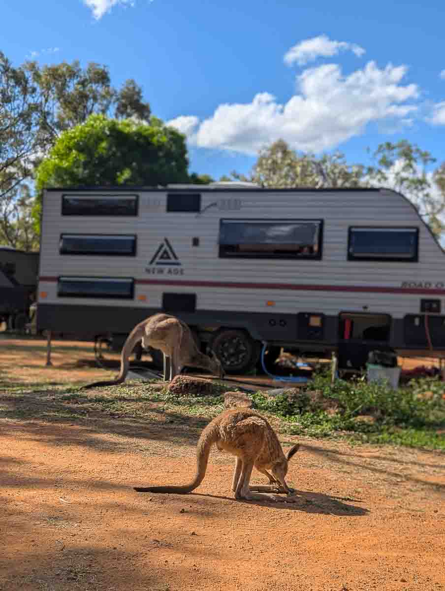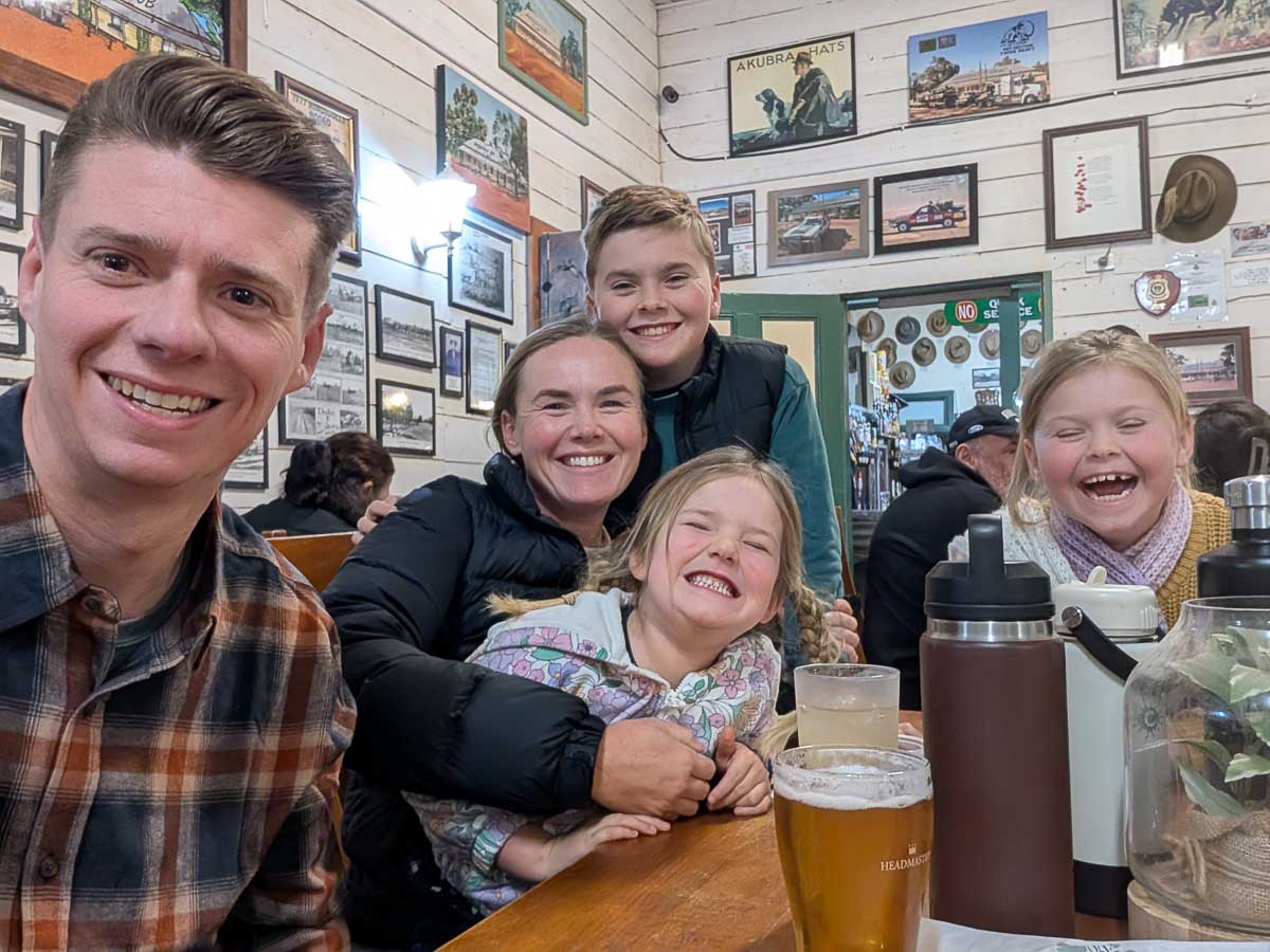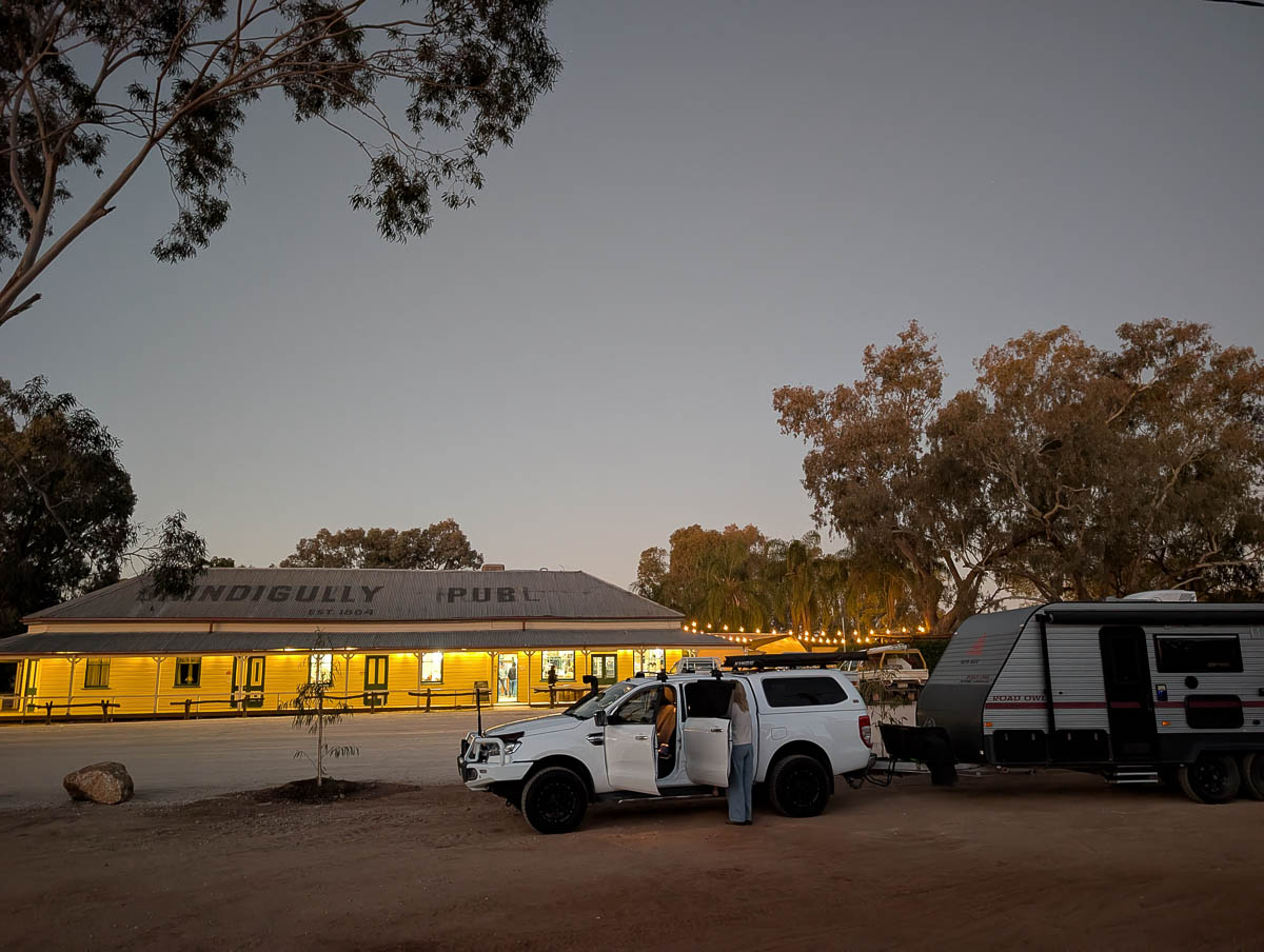 A big driving day, but it won’t be the biggest. Our first stop was only 20 minutes down the road as Kynie saw a Glee Coffee sign as we were driving through a nearby town. What started as two coffees ended up as $150 spent on goods at the attached small grocer. We next topped at Mitchell for some lunch and Curlewis for some water in the van and arrived at Nindigully Pub at dusk, just in time for another pub dinner. This is our second time to Nindigully but last time we ate in the van and just sat in the beer garden with a drink. Happy to support what is, judging by the dozens of caravans parked out back, still a thriving pub, despite its remoteness.