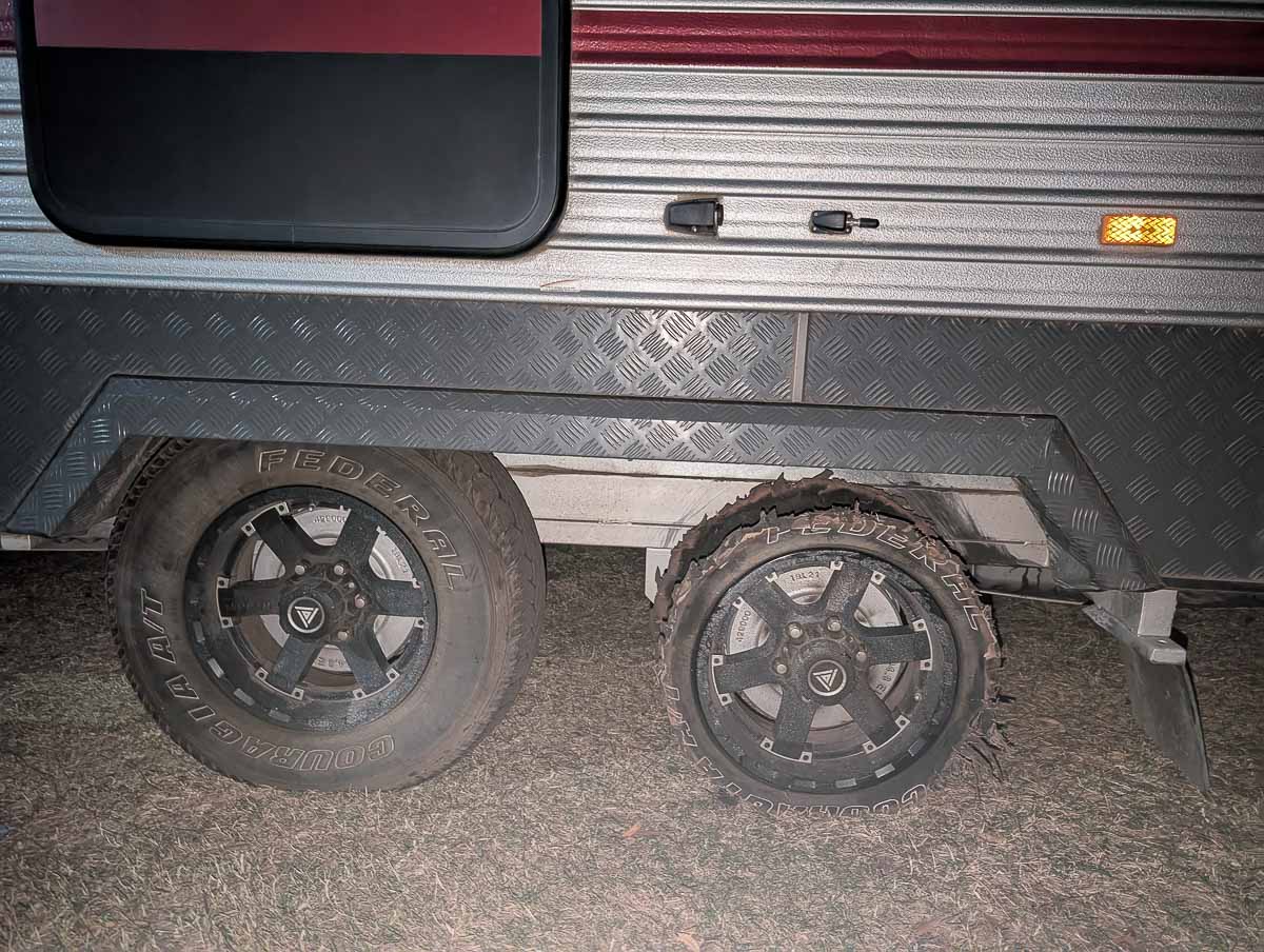 It was an uneventful day of driving to get as far north as Barcaldine and I had a free camp in mind to stay at a free camp I had found on Wikicamps but in the dark we couldn’t find it. Thankfully we still had phone service and ended up at a caravan park not far away. Upon pulling into the park, which doubled as a fuel station, I was informed by a fellow camper that we were missing a tire. Our left rear caravan tire was completely blown. More than blown. Absolutely shredded. we were lucky to be not scraping on metal, and if not for the other dual axle tire, we would have been. It seemed like devastating news, as I didn’t know how long we’d driven on it like this for. But the NRMA sorted me out and it looked like I had done no damage to the undercarriage so thankfully, after getting the spare changed in the morning, we were back on the road.