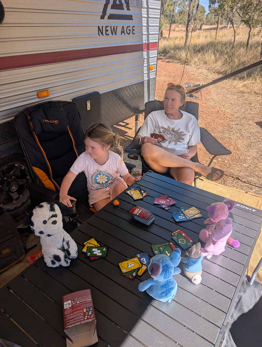 Our first non driving day. We had the day in Porcupine Gorge National Park at the Pyramid Campground. The campground is a few hundred metres from the gorge with a few walks one can take to see it. One to the rim with a great view down the valley towards the pyramid, and one that takes you down into the valley floor to the pyramid. We also drove 10 minutes to another lookout that had another view of a different section. The arvo was chill. We played games at the caravan (Cheating Moth and Macho Koro) while Lily and Kynie played Uno with 4 of Lily’s toys as the other players – Lily acted for them. Those of us who were not Kynie found it hilarious.
