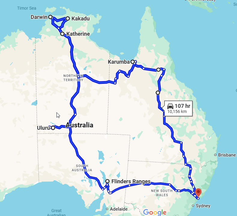 To give you a very broad idea of where we are going, we left Newcastle and headed north and we kept going until we hit water. We will then trek west to Darwin, Katherine, Litchfield and Kakadu before then heading south through the West Macdonnell Ranges, Uluru and surrounds, most of the Oodnadatta Track and the Flinders Ranges. We won’t quite hit water this time and will cut back east, hightailing it home via Broken Hill and Cobar.
