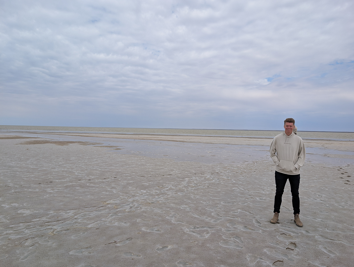 The road out is obviously rarely used. There aren’t many reasons to visit, even when there isn’t water in it, so the drive was various sizes of corrugations most of the way. It was pretty rough going to the point where you eventually get used to the constant vibrations. But the drive was worth it. The landscape is truly something else. Is went from desolate desert as far as the eye can see to rolling hills of black stone, creating something like a moonscape. As the only two cars that we had seen at that point it was weirdly eery. We stopped at the creatively named ABC Bay and walked out onto the lake because this section was not flooded. This was fascinating in itself because we got to see the lake in both filled and dry states. The top layer was crisp and salty but it cracked when you stepped and underneath, it was damp and soft.