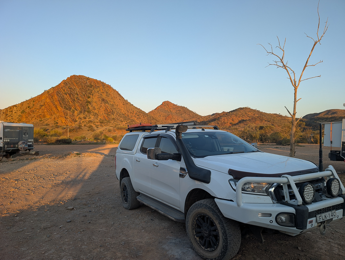Half an hour later we finally made it to our last stop: Leigh Creek. Leigh Creek has been trending towards ghost town status as a large coal mine that was started in the 1940s shut down 10 years ago and the town has been in decline ever since. The caravan park was quite unconventional and we think we parked on old slabs of mining cottages as we could see the drains in the concrete where the bathroom probably have been.