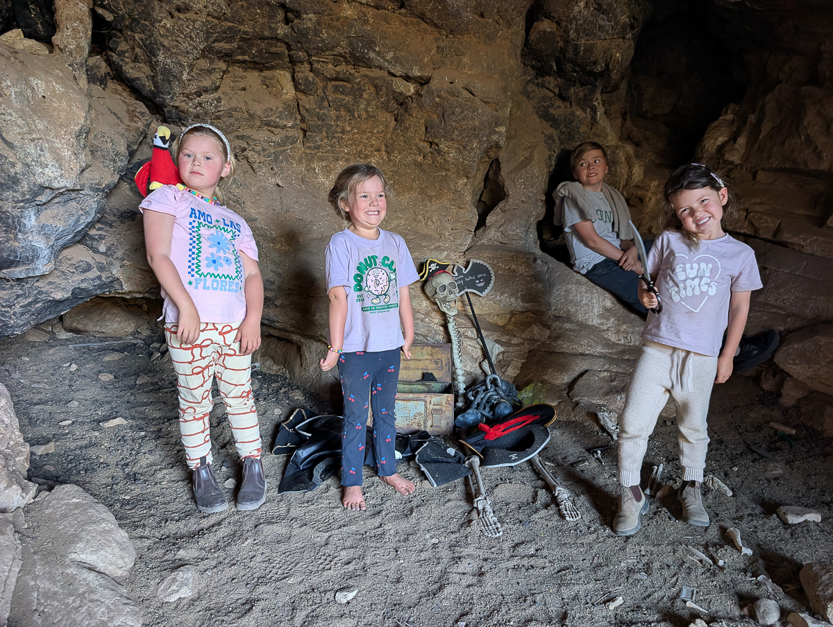 It was a beautiful walk and I enjoyed seeing what the hills we’d been looking at from afar look like up close. Inside the cave was a pirate skeleton and a chest with some pirate toys and dress ups.