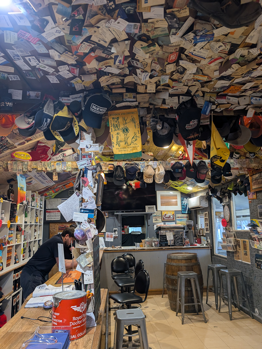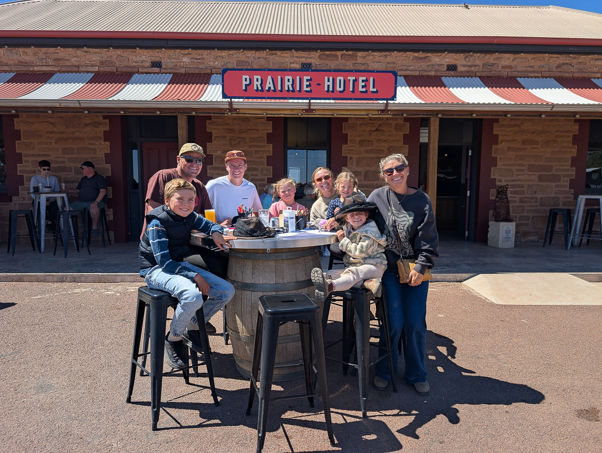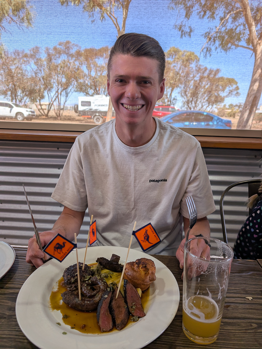 The Prairie Hotel is known for its “feral feast”, which enables you to eat what’s on our coat of arms. Matt and I got the feral mixed grill which included emu rissoles, camel boerworst sausage, and kangaroo fillet. It was surprisingly good and not weird at all. Prairie is also South Australia’s most remote brewery, so we sampled a couple and with a few SA pints in us, we hit the merch stand pretty hard.