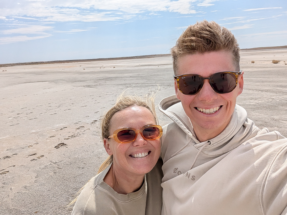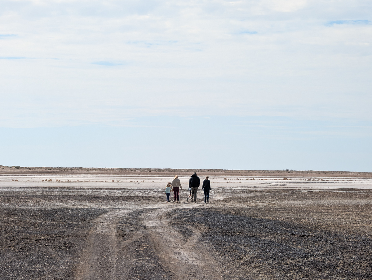 The road out is obviously rarely used. There aren’t many reasons to visit, even when there isn’t water in it, so the drive was various sizes of corrugations most of the way. It was pretty rough going to the point where you eventually get used to the constant vibrations. But the drive was worth it. The landscape is truly something else. Is went from desolate desert as far as the eye can see to rolling hills of black stone, creating something like a moonscape. As the only two cars that we had seen at that point it was weirdly eery. We stopped at the creatively named ABC Bay and walked out onto the lake because this section was not flooded. This was fascinating in itself because we got to see the lake in both filled and dry states. The top layer was crisp and salty but it cracked when you stepped and underneath, it was damp and soft.
