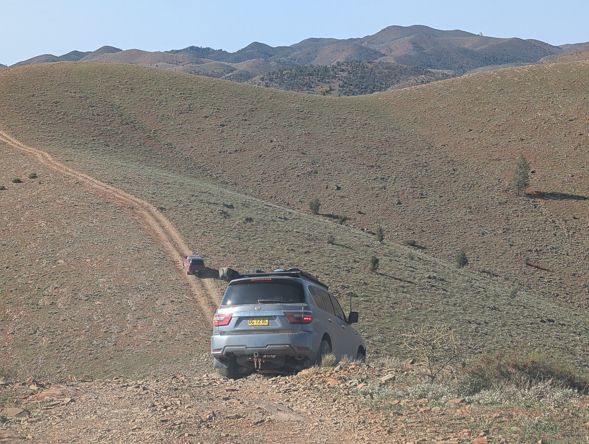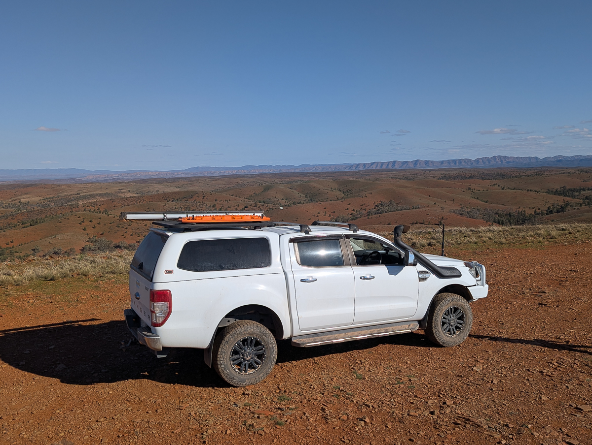 Finally we get to a gate that is locked where they say “if any of that was too challenging for you, skip this bit, there is a shortcut back to the campsite”. That is because this is where the real 4wding starts. We commenced a very steep climb to the point where we could only just see the road in front of us because of the angle the Ranger was on. Hence the name “Skytrek”, because going up the hill, that’s all we could see. It took us up to a magnificent lookout surrounded by mountains. This was low range driving and in comparison to the drive at Arkaroola, was much more challenging. I stayed in first gear low range for a lot of these sections because it was so rocky and so steep.